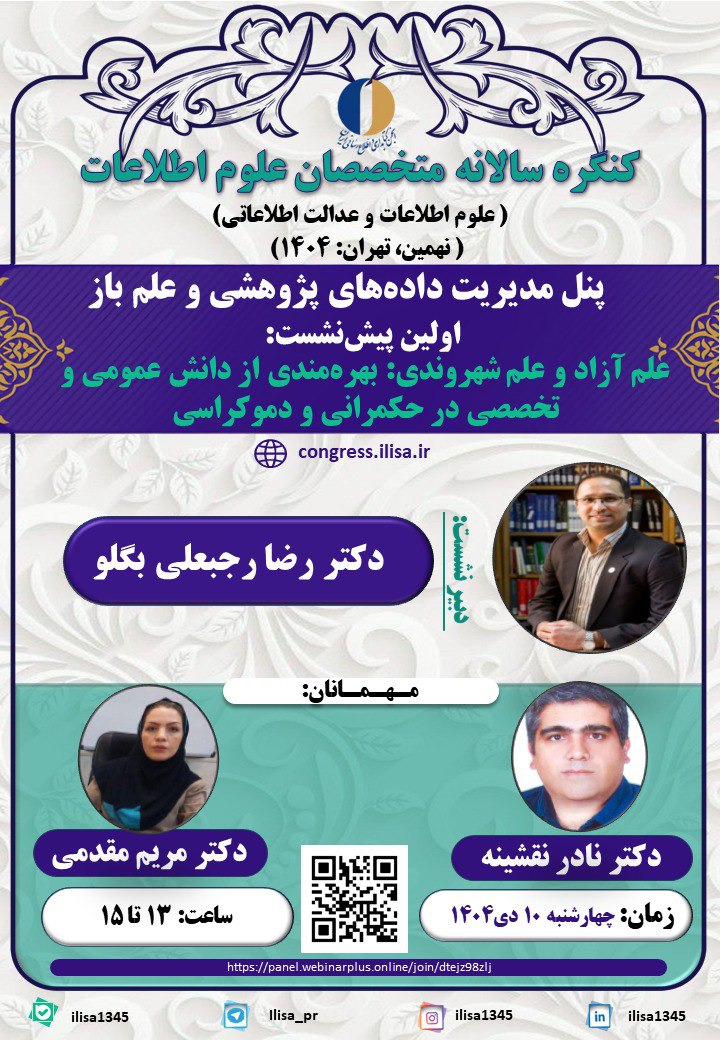 اولین پیشنشست پنل مدیریت دادههای پژوهشی و علم باز در نهمین کنگره سالانه متخصصان علوم اطلاعات با عنوان “علم آزاد و علم شهروندی: بهرهمندی از دانش عمومی و تخصصی در حکمرانی و دموکراسی ” روز چهارشنبه ۱۰ دی ۱۴۰۴ ساعت ۱۳ تا ۱۵ به صورت مجازی برگزار میشود.