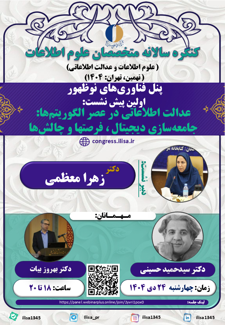 اولین پیشنشست پنل فناوریهای نوظهور نهمین کنگره سالانه متخصصان علوم اطلاعات با عنوان ”عدالت اطلاعاتی در عصر الگوریتمها: جامعهسازی دیجیتال، فرصتها و چالشها” روز چهارشنبه ۲۴ دی ۱۴۰۴ از ساعت ۱۸ تا ۲۰ به صورت مجازی برگزار میشود.