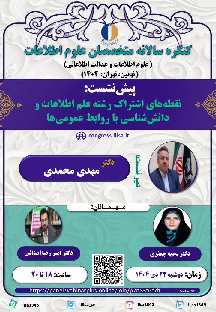پیشنشست با عنوان ” نقطههای اشتراک رشته علم اطلاعات و دانششناسی با روابط عمومیها ” نهمین کنگره سالانه متخصصان علوم اطلاعات روز دوشنبه ۲۲ دی ۱۴۰۴ ساعت ۱۸ تا ۲۰ به صورت مجازی برگزار میشود.