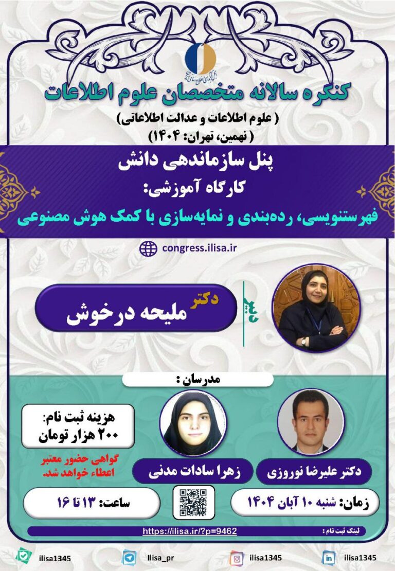 کارگاه آموزشی توسط دکتر علیرضا نوروزی، استاد گروه علم اطلاعات، دانشکدگان مدیریت، دانشگاه تهران و زهرا سادات مدنی، دانشجوی کارشناسی ارشد گروه علم اطلاعات، دانشکدگان مدیریت، دانشگاه تهران و دکتر ملیحه درخوش به عنوان دبیرنشست برگزار میشود.