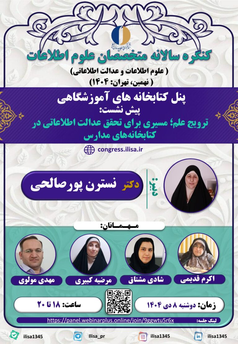 پیش نشست پنل کتابخانه‌های آموزشگاهی نهمین کنگره سالانه متخصصان علوم اطلاعات با عنوان ” ترویج علم؛ مسیری برای تحقق عدالت اطلاعاتی در کتابخانه‌های مدارس”  روز دوشنبه ۸ دی ۱۴۰۴ ساعت ۱۸ تا ۲۰ به صورت مجازی برگزار می‌شود.