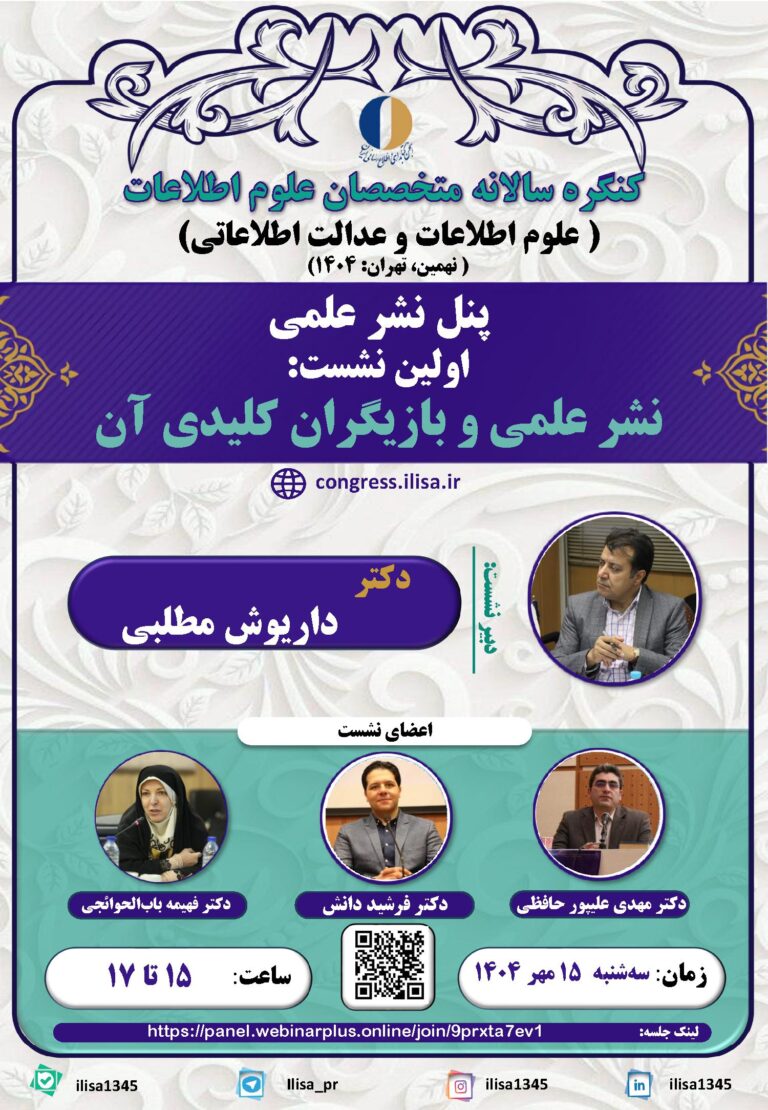 اولین پیش نشست پنل مسائل نشر علمی نهمین کنگره سالانه متخصصان علوم اطلاعات با عنوان ” نشر علمی و بازیگران کلیدی آن” روز سهشنبه ۱۵ مهر ۱۴۰۴ ساعت ۱۵ به صورت مجازی برگزار میشود.