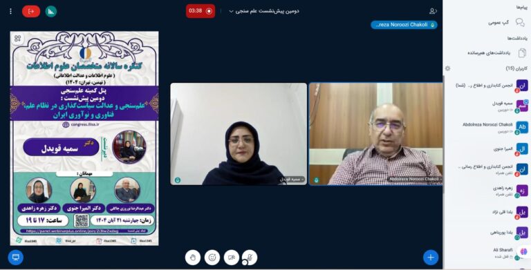 دومین پیش‌نشست علم‌سنجی، با عنوان《علم‌سنجی و عدالت سیاست‌گذاری در نظام علم، فناوری و نوآوری ایران》به دبیری دکتر سمیه قویدل و با حضور دکتر عبدالرضا نوروزی چاکلی (استاد علم اطلاعات و دانش‌شناسی دانشگاه شاهد)،  دکتر المیرا جنوی (استادیار گروه پژوهشی ارزیابی سیاست‌ها، پایش علم، فناوری و نوآوری) و دکتر زهره زاهدی (استادیار گروه علم اطلاعات و دانش‌شناسی دانشگاه خلیج‌فارس) به‌عنوان سخنران در روز چهارشنبه ۲۱ آبان‌ماه ۱۴۰۴ ساعت ۱۷ تا ۱۹ در وبینارپلاس نهمین کنگره سالیانه متخصصان علوم اطلاعات به‌صورت مجازی برگزار شد.